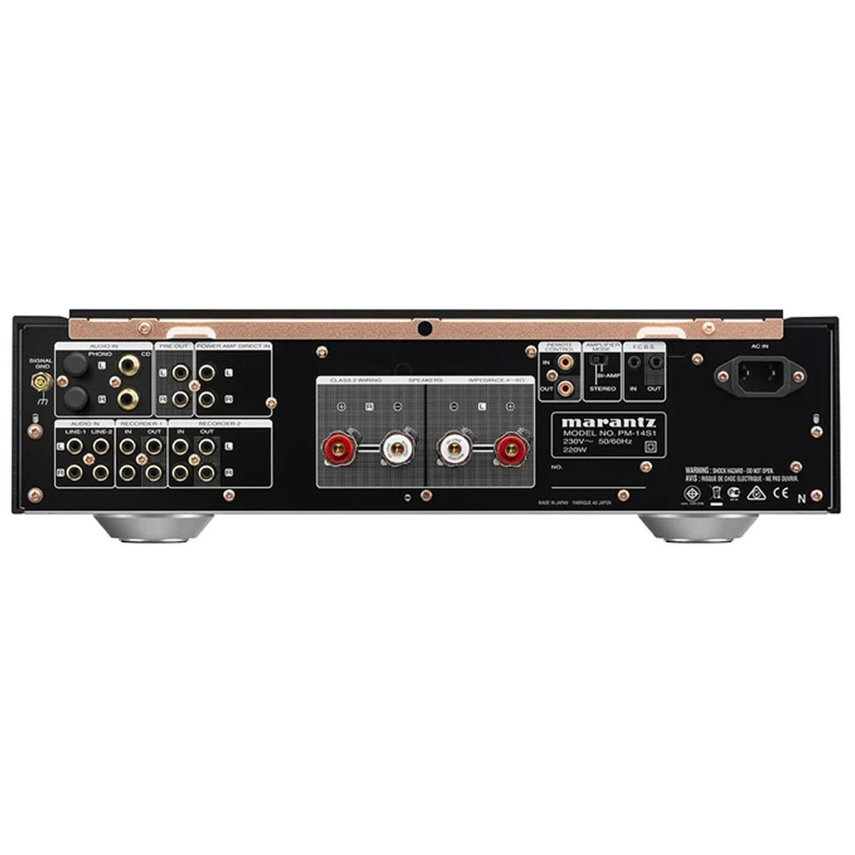 A: The PM-14S1SE has high-purity copper speaker terminals for connecting two sets of speakers. It also has a bi-amp/stereo switch that allows you to bi-amp compatible speakers for potentially improved sound quality.